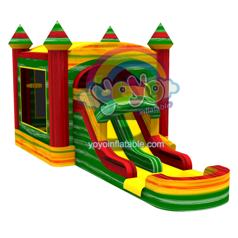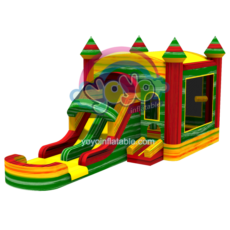 This red green marble inflatable wet dry combo uses eye-catching water-grained material colors, combining a bounce house with a slide, which can be used for dry or wet activities. The slide is a double-lane slide with a curved black safety net on the top to protect the safety of children playing. The trampoline part is in the shape of a castle, and there are black safety nets around it. Parents can see the children inside, and the net can also protect the safety of the children inside and prevent them from falling out.