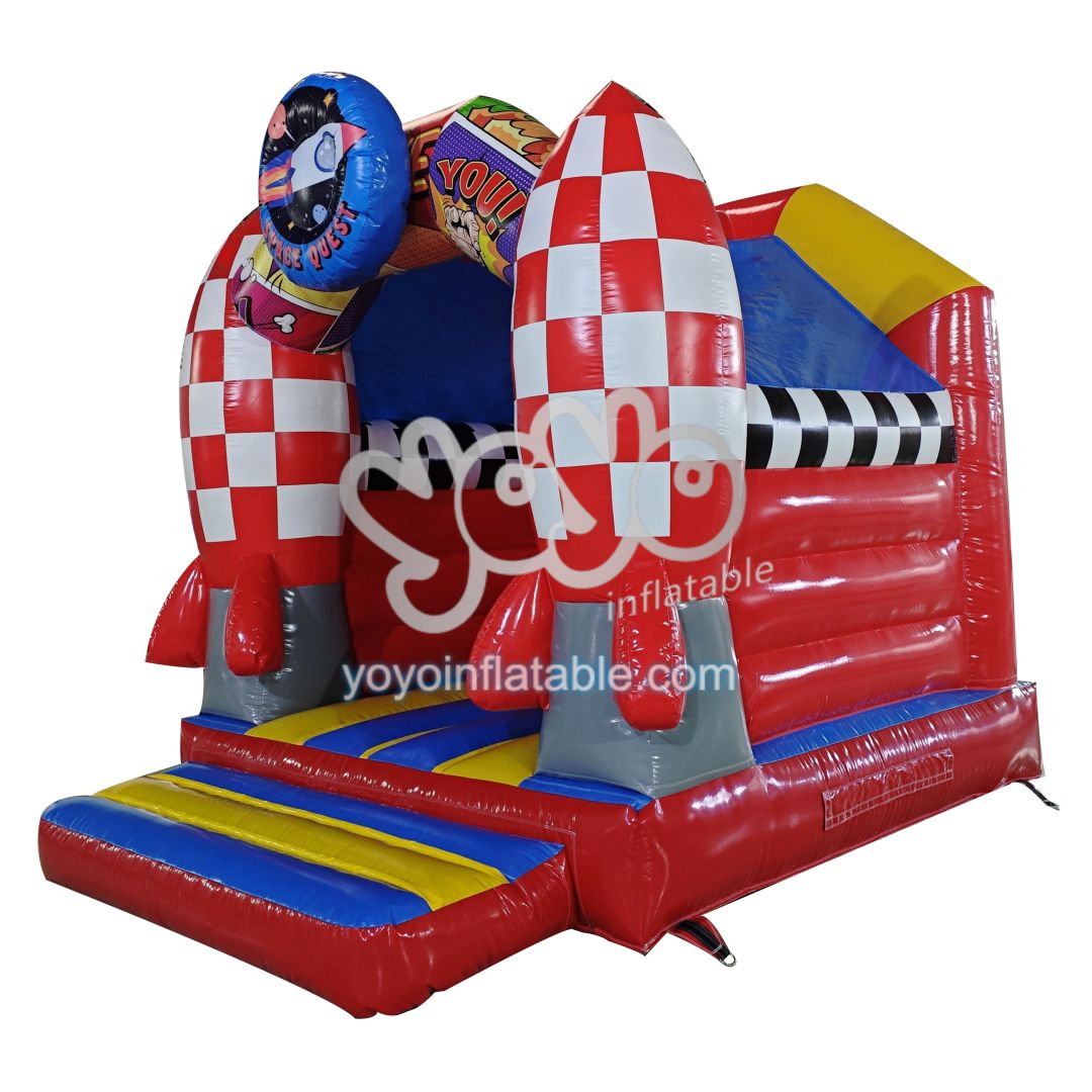 The rocket space quest inflatable bounce house is a compact, kid-sized wonder designed for little adventurers. Its eye-catching color scheme blends vibrant red, sunny yellow, bright blue and subtle gray, paired with vivid space-themed printings that spark imagination, especially for boys. The entrance features two rockets forming an arch, with the bold “Space Quest” theme clearly displayed above, making it instantly appealing. Crafted with original design, it stands out as a unique inflatable bouncer, perfect for turning backyards into cosmic play zones.
