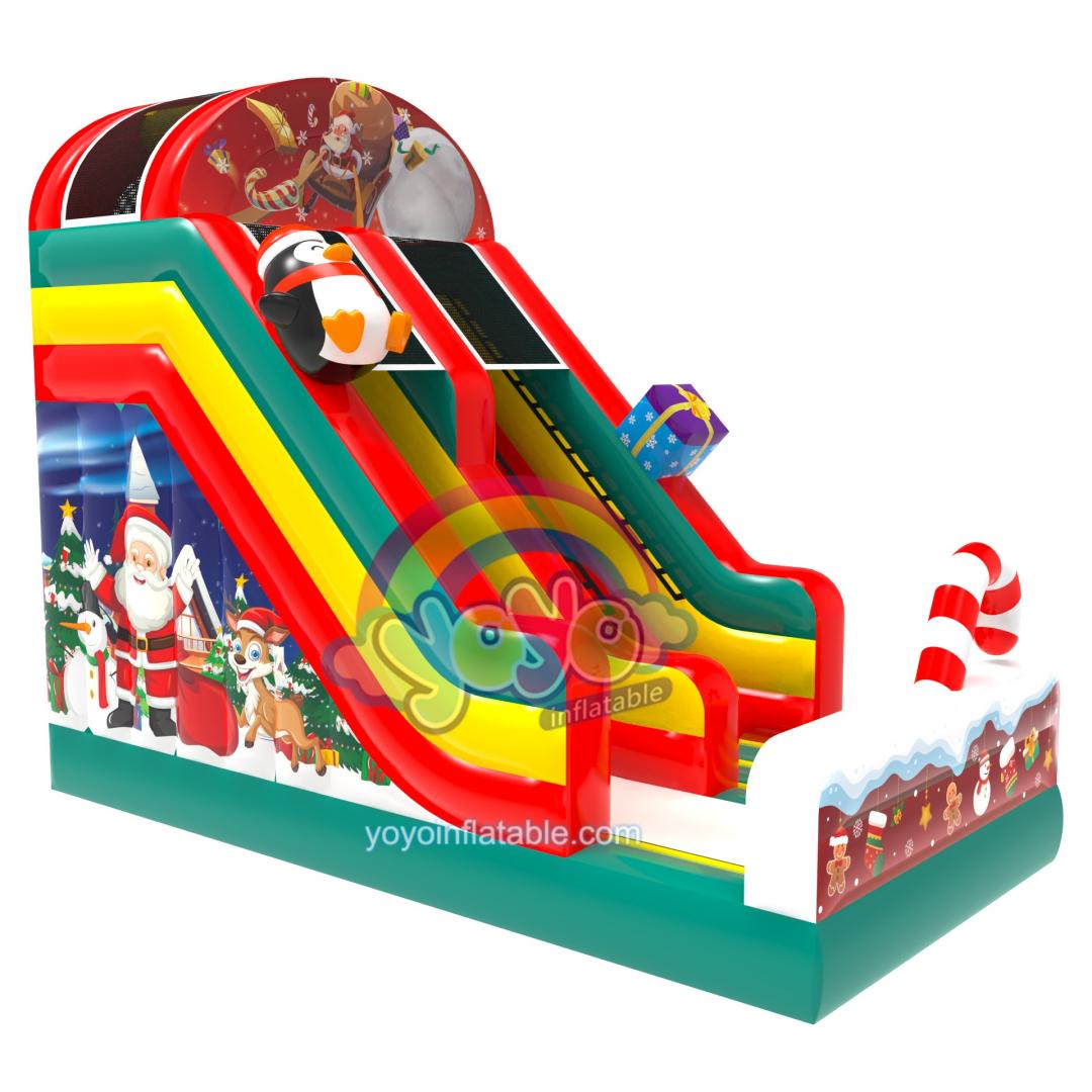 Enjoy classic holiday joy with this engaging inflatable dry slide, perfectly sized for seasonal events. Its 6-meter length, 3-meter width, and 5-meter height feature a single slide lane with a cheerful penguin in a Santa hat and a separate climb lane with a gift box, reinforced handles and safety straps. The arched top showcases a detailed Santa sleigh graphic, while base walls and sides display festive candy cane motifs.