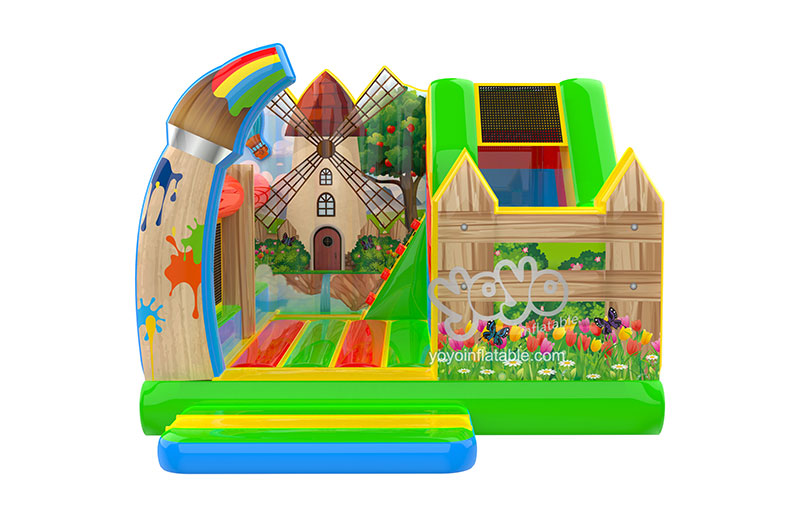 Boasting a vibrant rainbow-hued roof adorned with charming windmill and hot air balloon patterns, this sky island inflatable combo is a visual delight that instantly captivates. Measuring approximately 5 meters in length and 4.4 meters in width, it’s spacious enough to accommodate multiple children, fostering camaraderie and shared joy.
