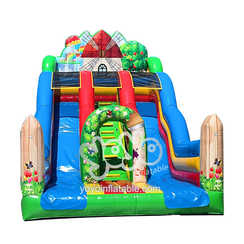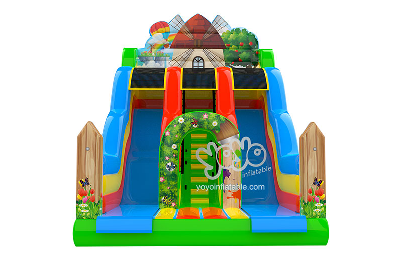 Soaring high on an imaginary journey, this sky island theme inflatable slide combines vibrant hues with beautiful printing. The vibrant color slide body stands out, while the windmill roof house invite children into a world of fantasy sky city.