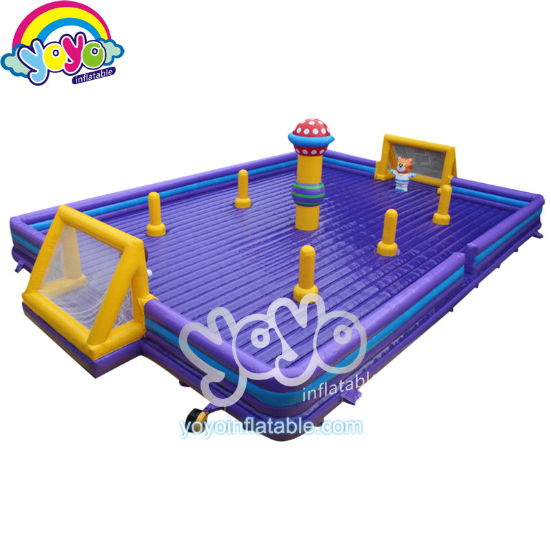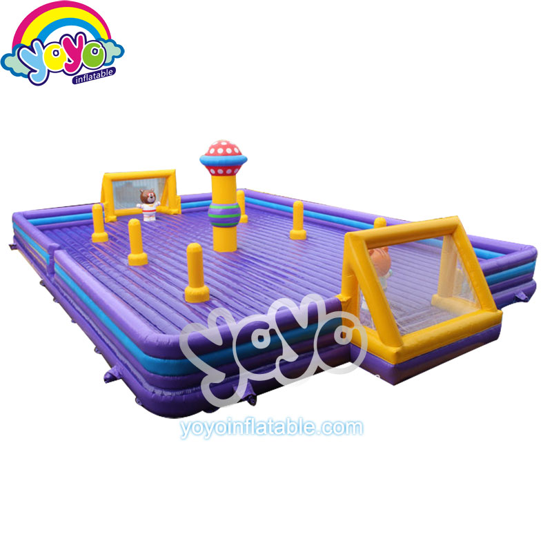 This large inflatable football field amusement park is designed with the space theme like the blue space ship playground. As you can see, the base structure is a giant inflatable football field, with to cartoons as the goalkeepers and some obstacle pillars for more fun. A giant inflatable space ship controller column in the center. Kids can play space football with friends inside this playground. They can run and bounce up and down like they are actually walking on the moon. In addition, you can also use this big inflatable amusement park as a large ocean ball pit.