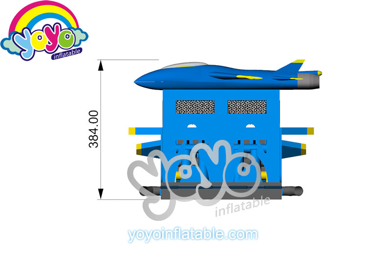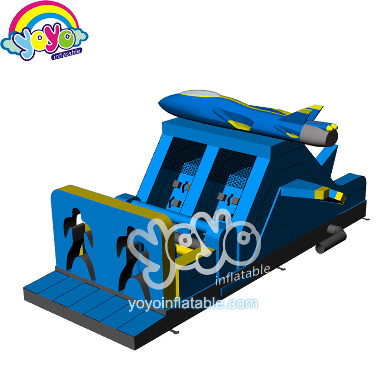 This blue space shuttle theme inflatable obstacle course is a great and effective design for children. A giant inflatable space plane cartoon on the top, very attractive and fun. Looks like that the space base is selecting astronauts. If you can win this fun obstacle course, you can be the chosen one. The 29 feet long obstacle course structure is double players design, with two racing lanes for two challengers to complete each other. The first obstacle is a human-shaped door, an inflatable pillars jungle is behine the entrance wall. Then there is a inflatable fence in the middle, a climbing wall with slide at the end. Very fun and attractive for children. Suitable for parties and outdoor events.