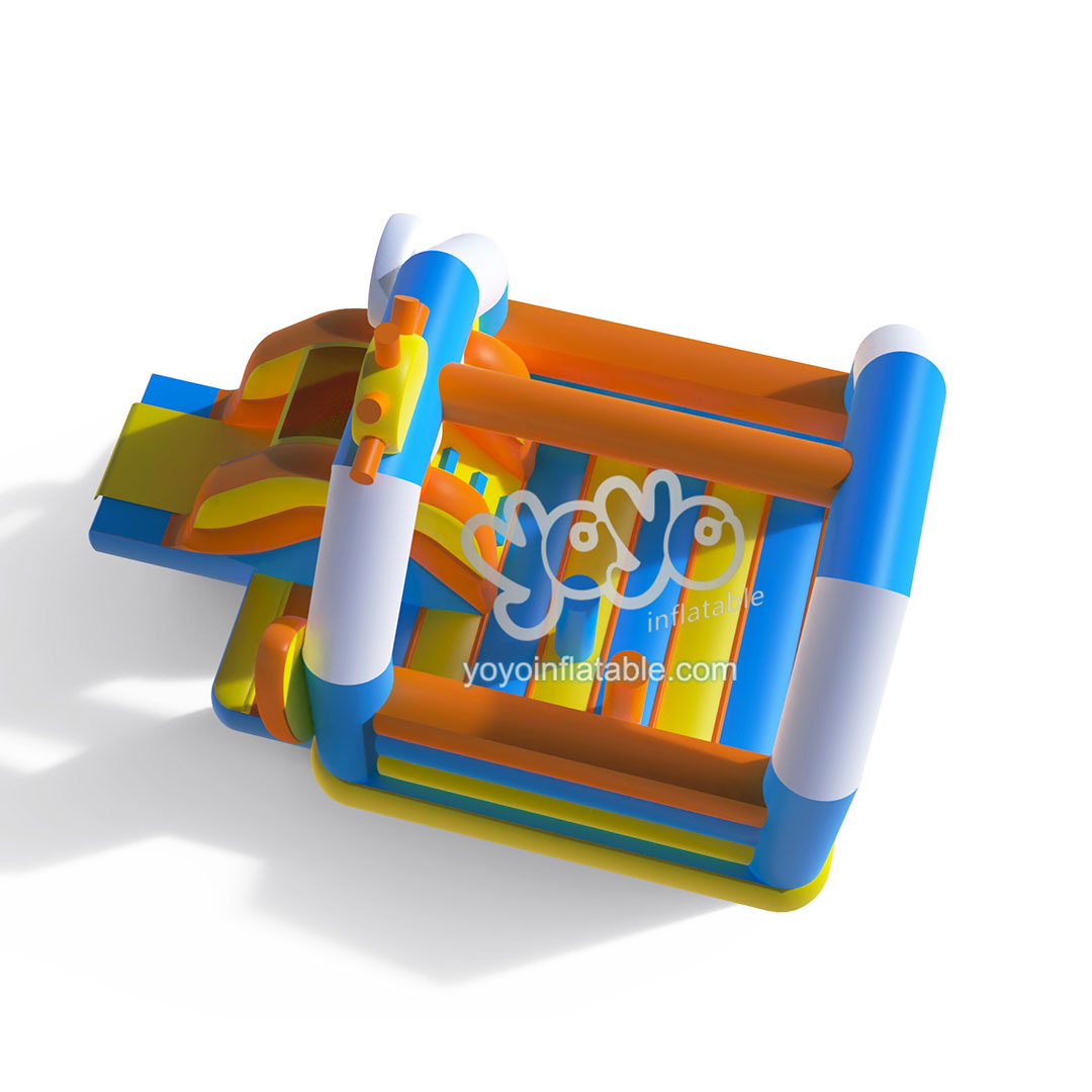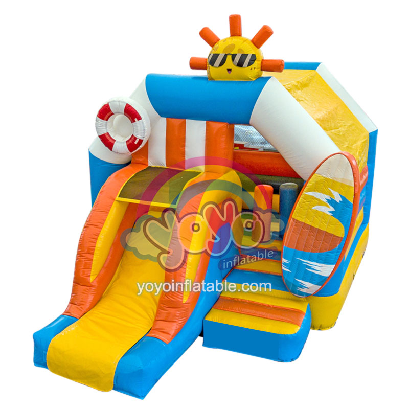 This sunny beach holiday theme inflatable bouncer combo is a little smaller than other units, because it’s specially designed for smaller kids. The entire structure is a fully enclosed design and has sun protection cloth on the top. In addition to the bright and colorful printing on the outside, there are also some inflatable lifebuoy, surfboard and rudder designs to make this unit more attractive to children.