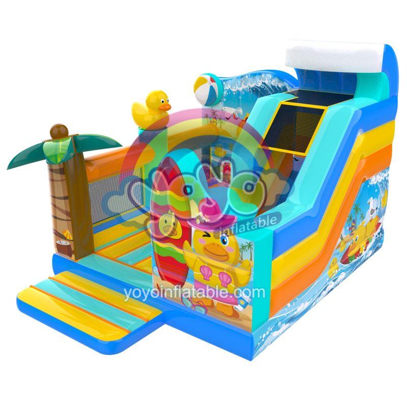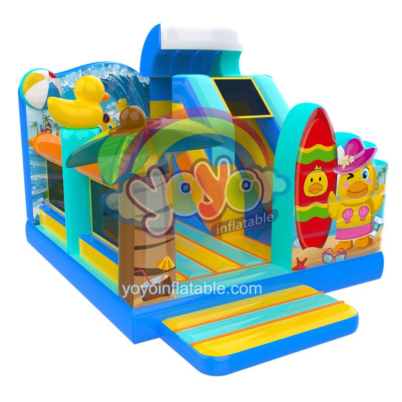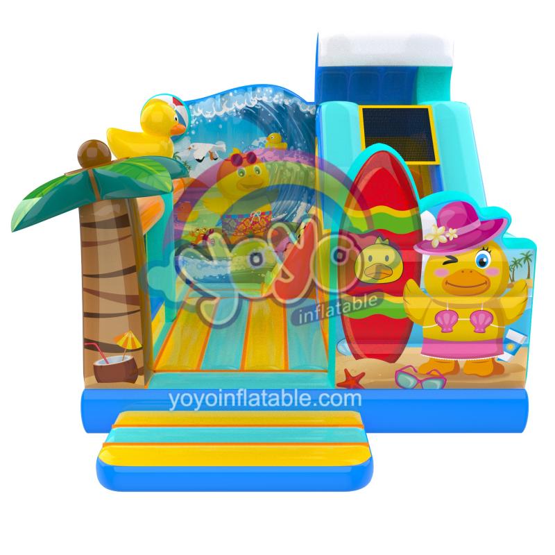 Dive into endless fun with the surfing duck dry inflatable slide combo YY-CO250229, a premium original design inflatable that blends excitement and safety. This dual-function combo features a thrilling slide and bouncy area, perfect for active play. The entrance steals the show with a vibrant beach scene: a bikini-clad duck clutching her surfboard beside a swaying palm tree, instantly transporting kids to a tropical paradise.Inside, the yellow duck-themed interior dazzles with dynamic surfing graphics, playful duck-and-beach-ball pillar accents, and a wave-shaped roof canopy that adds immersive charm.