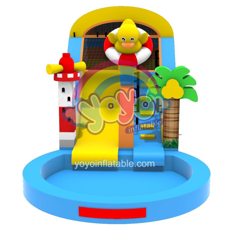 This duck-themed splash zone features an integrated pool and 3.2m height water slide crowned by a surfing duck character on a swimming ring. Safety nets surround the slide platform while lighthouse and palm tree accents enhance beach vibes. Vibrant yellow, blue and orange ripple-textured pvc creates a joyful coastal playground perfect for kids.