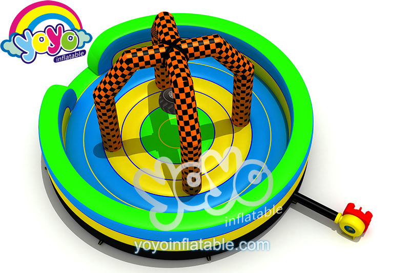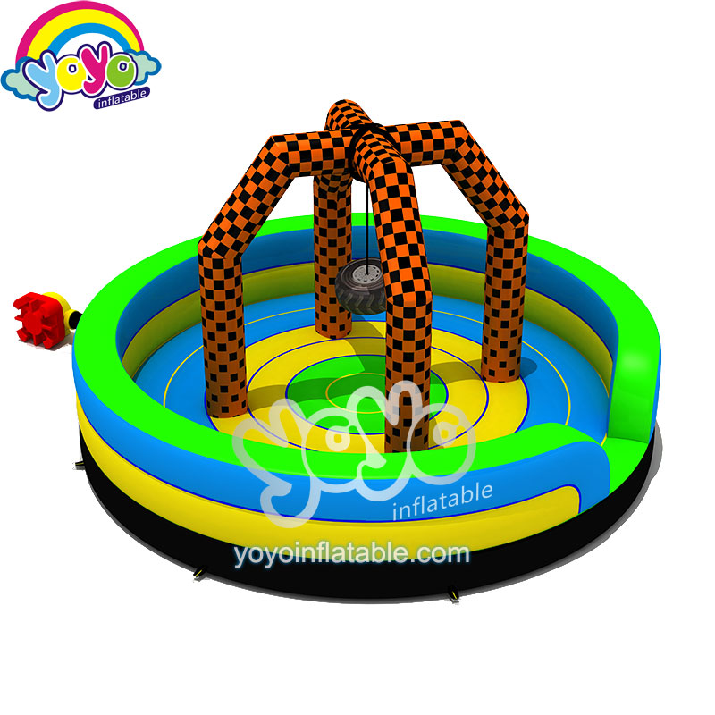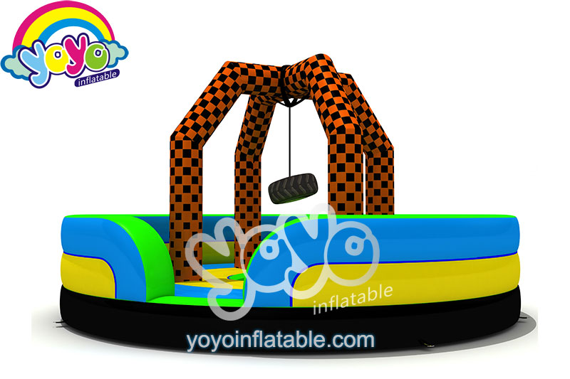 This 2-in-1 inflatable sport game is a super cool and fun design. A giant inflatable frame with a suspended tire on the round inflatable platform. Kids can sitting on the tire ti play it like a swing, and they can stand on different spots to pushing this inflatable tire as dodge ball. Very playful and exciting! They can run, bounce and hide from the inflatable ball for fun. This great inflatable game structure is made of commercial grade 15oz and 0.45mm pvc material, durable for your party rental business.