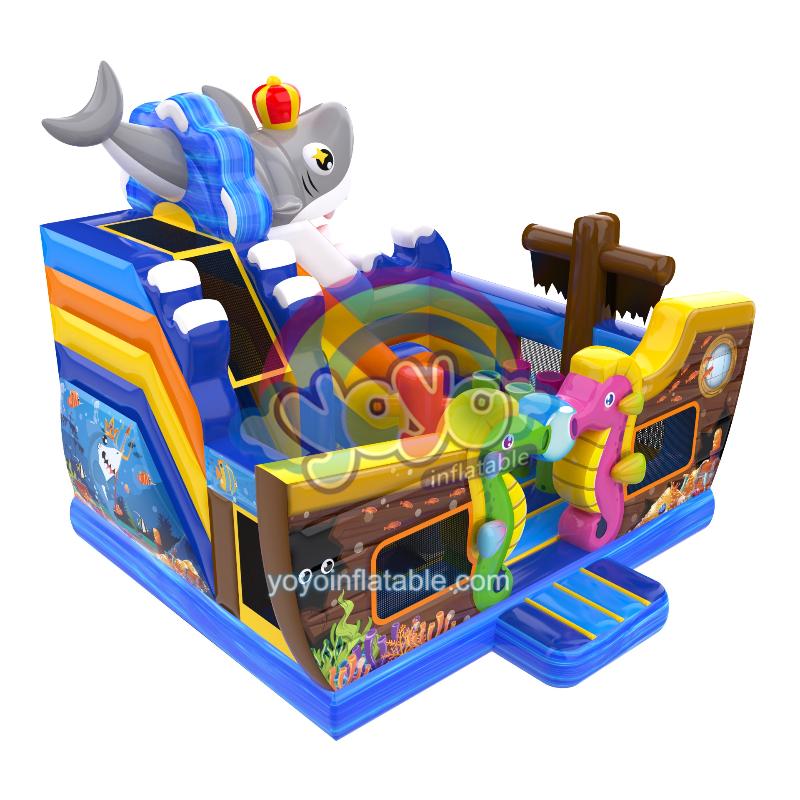 Spark curiosity with this undersea kingdom bounce house slide combo, where undersea adventures come alive! A wooden ship facade and playful seahorse entry lead to an obstacle-filled interior featuring posts, ride-ons and dart targets. The highlight? A shark decor slide on the top with wave accents decors, secured by full-coverage black safety nets. Vibrant ocean-themed graphics adorn all around, while reinforced seams and pvc strips ensure lasting durability for energetic play.