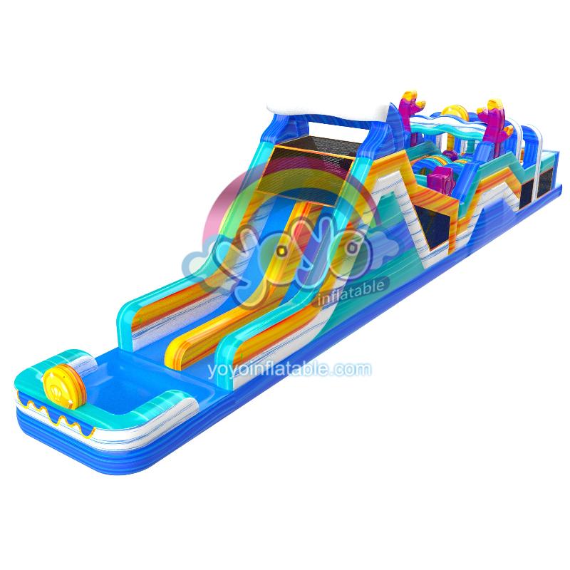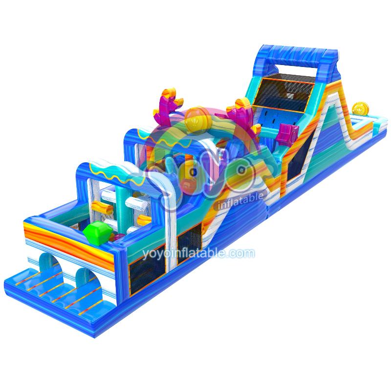 This undersea treasure inflatable obstacle course is a premium, original-design inflatable crafted for endless fun. The marble-textured exterior blends blue, white, yellow, lake blue and rose red hues, mimicking ocean waves and treasures. Split into three themed zones, it starts with twin emerald-adorned arches leading to the obstacles challenges: climb wall obstacles, pillars, drop shot and tunnel small slide crowned by a coral-and-shell arch—perfect for sparking imaginative play. Safety meets style here, with every edge reinforced for durability and waterproof materials ensuring long-lasting use.