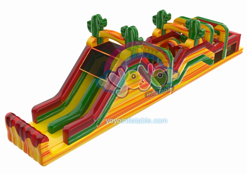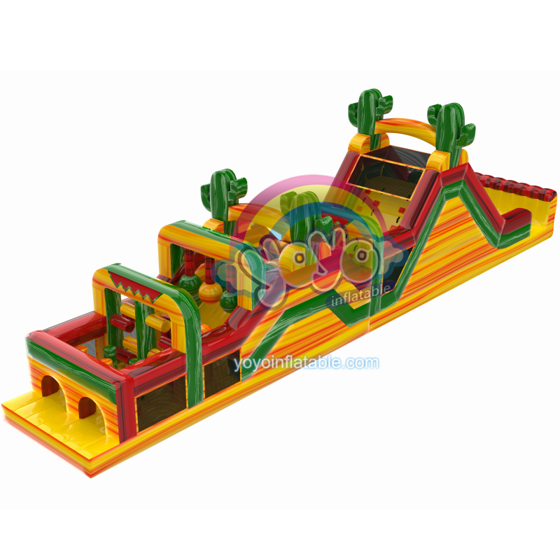 Unleash your inner cowboy and dive into the thrilling world of this western desert obstacle course bounce house! With a total length of 20 meters, this obstacle course split into two exciting parts, each offering unique challenges and obstacles. The vibrant colors of yellow, red and green evoke the spirit of the wild west, while the desert-themed obstacles, including cacti and rocky hills, add an extra layer of excitement and engagement.
