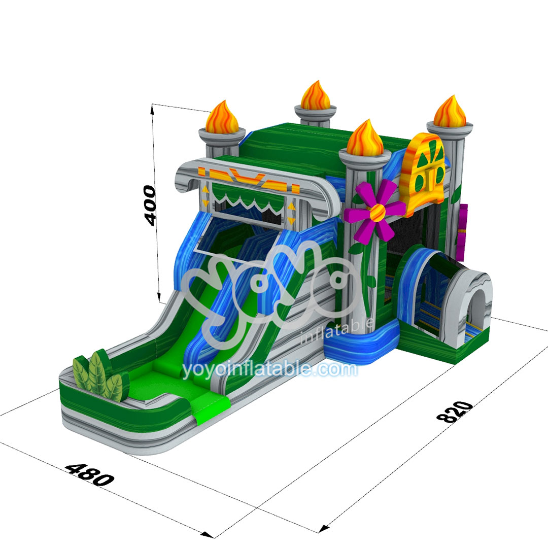 This wet dry bounce house slide combo is designed with the green plant theme, you can find a lot of forest elements, such as the inflatable castle looks like an ancient pyramid, and is decorated with flowers, leaves, and green lawns. The tops of the four pillars are designed to look like huge torches. Comes with two inflatable pillars, two climbing stairs and one basketball hoop inside, a double lane water slide with a small inflatable water pool on the outside. Made of commercial grade high end Marble colors PVC fabric, more advanced, more attractive and more durable.
