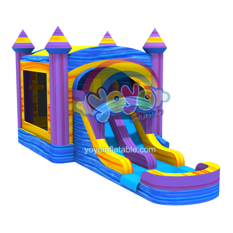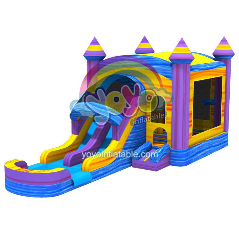 This yellow marble wet dry combo bounce house is an original design inflatable that combines the thrill of bouncing with the excitement of sliding in one vibrant package! The striking color palette of purple, yellow and blue making it an eye-catching addition to any event or party. The included small splash pool adds an extra element of fun, perfect for cooling off on hot days. Whether you’re hosting a backyard barbecue, a pool party, or a community event, this combo is sure to be a hit with kids and adults alike.